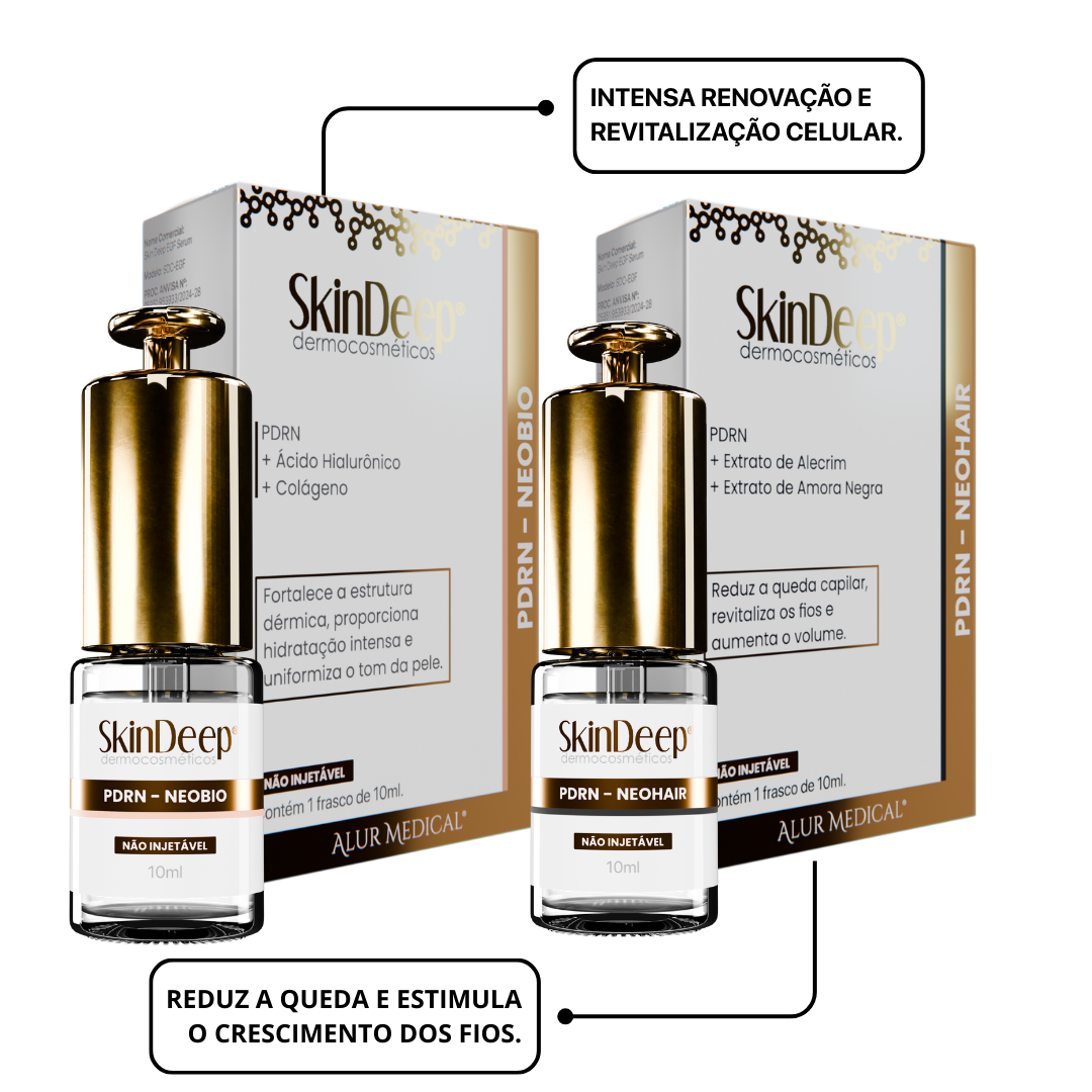 A SkinDeep® apresenta dois dermocosméticos inovadores que estão transformando protocolos estéticos e capilares: PDRN-NEOBIO e PDRN-NEOHAIR. Com fórmulas não injetáveis e alta concentração de ativos (2%), esses séruns oferecem resultados visíveis e eficazes desde as primeiras aplicações